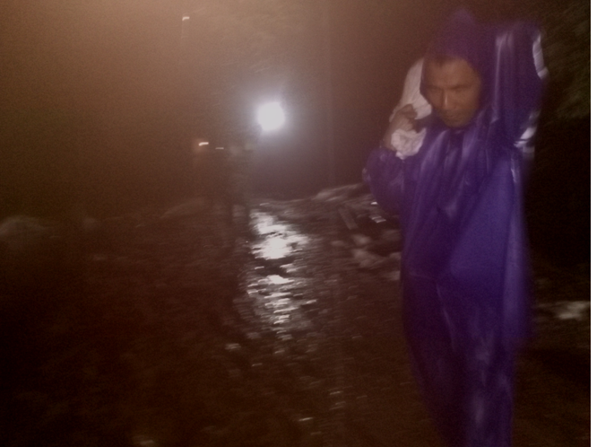 图为:深夜“五老”志愿者正在扛运土包